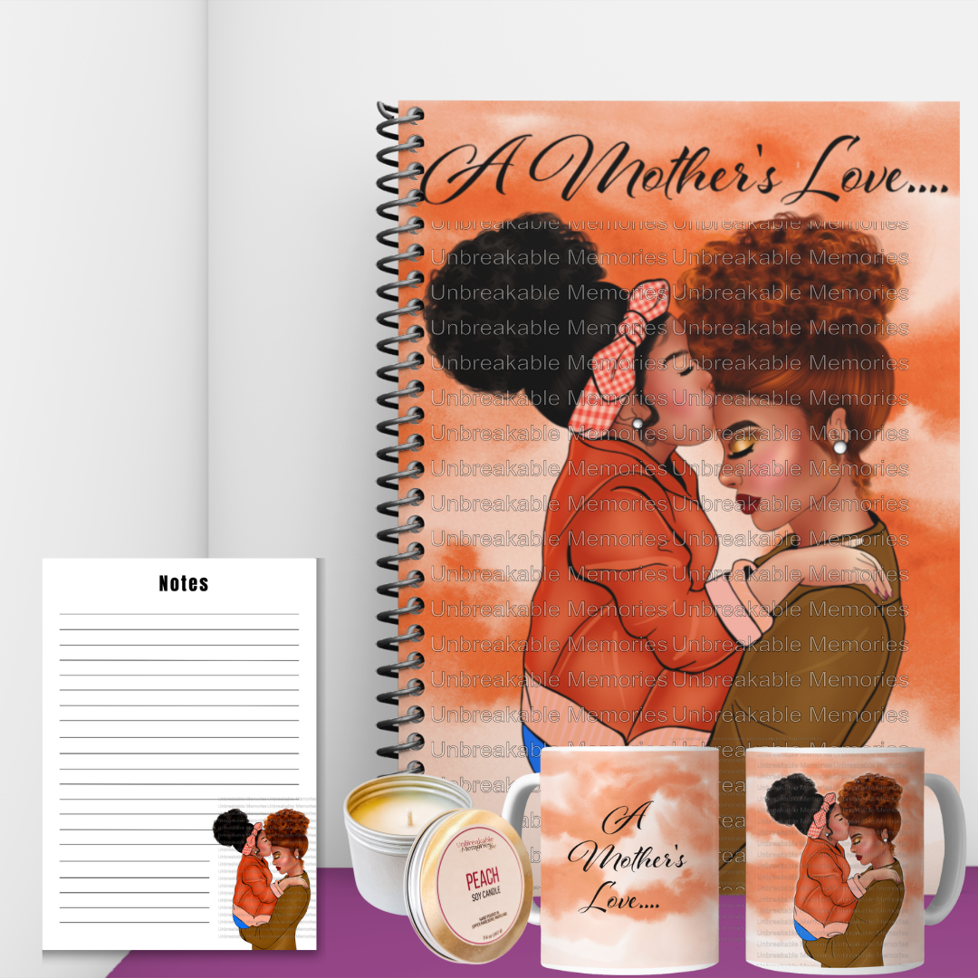 A Mother's Love gift box is for that special mom who needs a little pampering! Just imagine the candle is lit, the calming aroma fills the air from our hand poured soy candle as she sips on her favorite tea or coffee in the beautiful mug. She's writing her gratitude, journaling her thoughts and releasing her fears in our handmade notebook. But because she's always on the go, our notepad is perfect for taking those quick notes as she carries out her day!