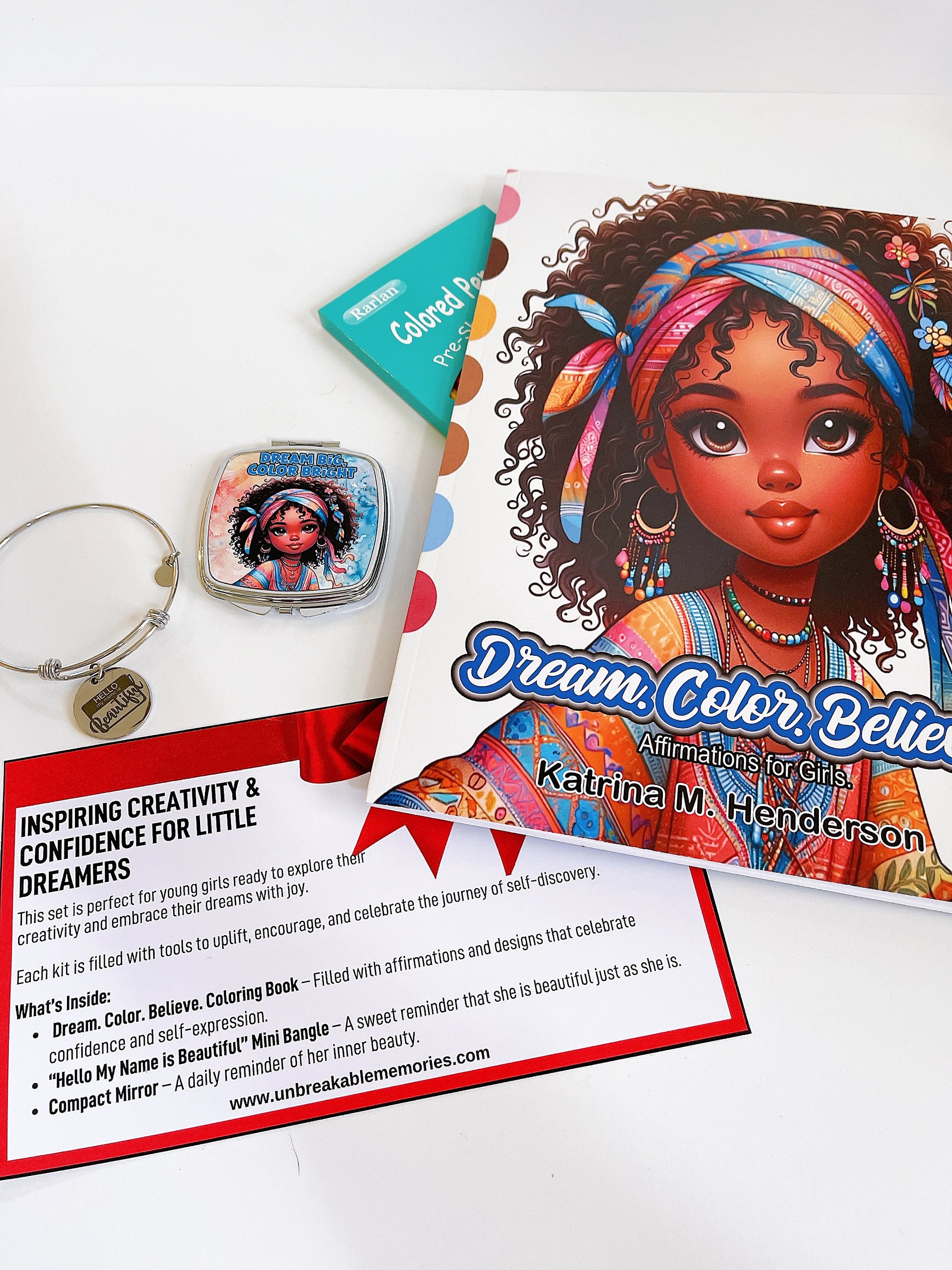 The Dream Big, Color Bright Gift Set is designed to nurture her creativity, instill confidence, and celebrate the beauty of who she is. From the empowering words in the coloring book to the charming affirmation bangle, each item encourages her to explore her dreams and believe in herself. It’s a thoughtful, inspiring gift that empowers her to embrace her beautiful journey and color her world with joy and positivity.