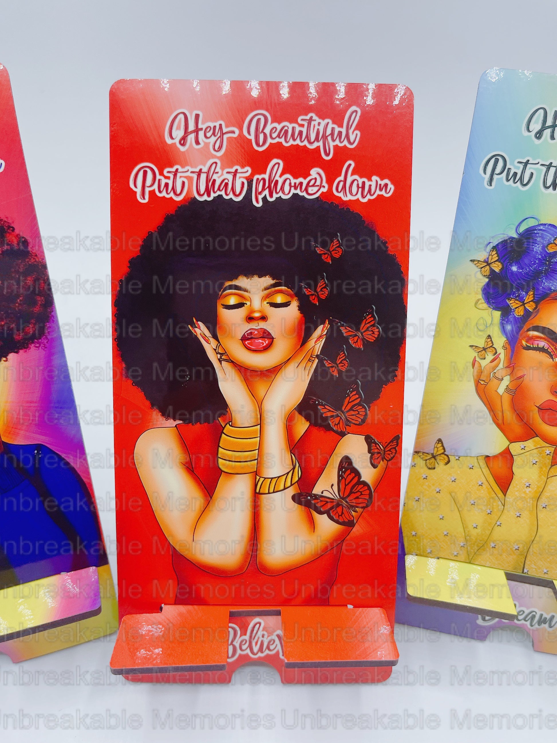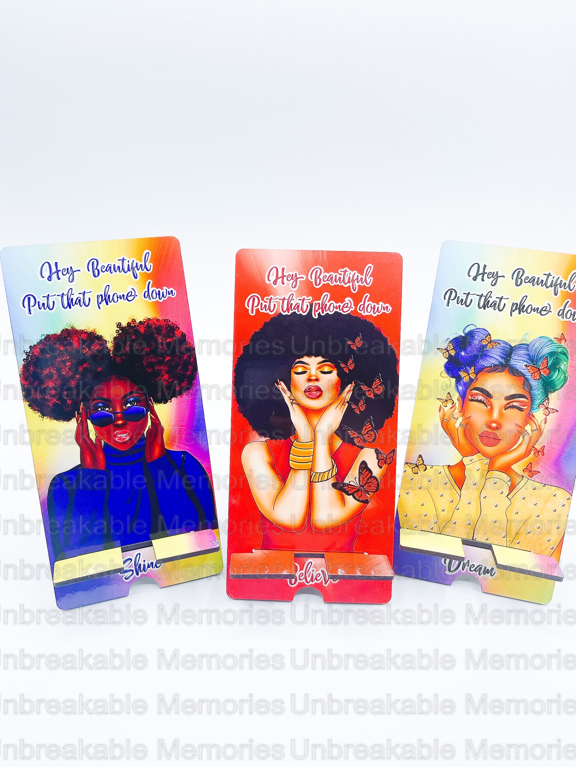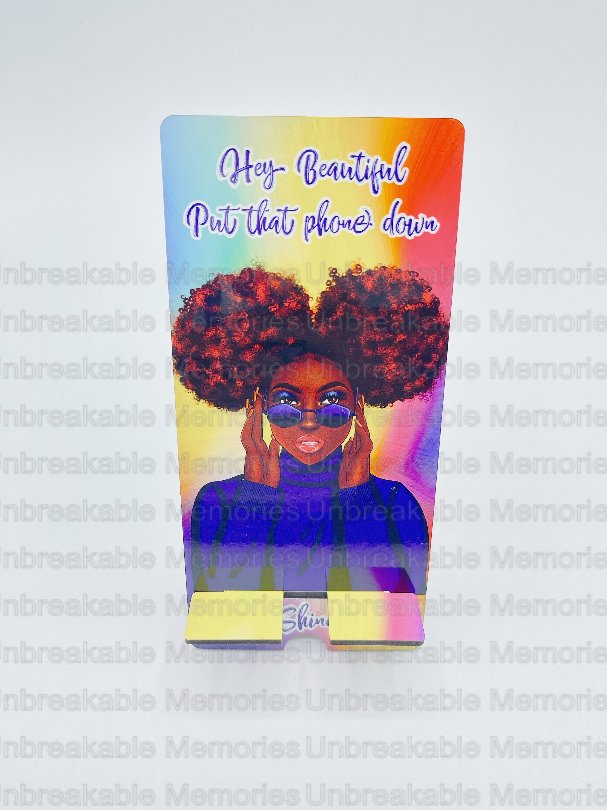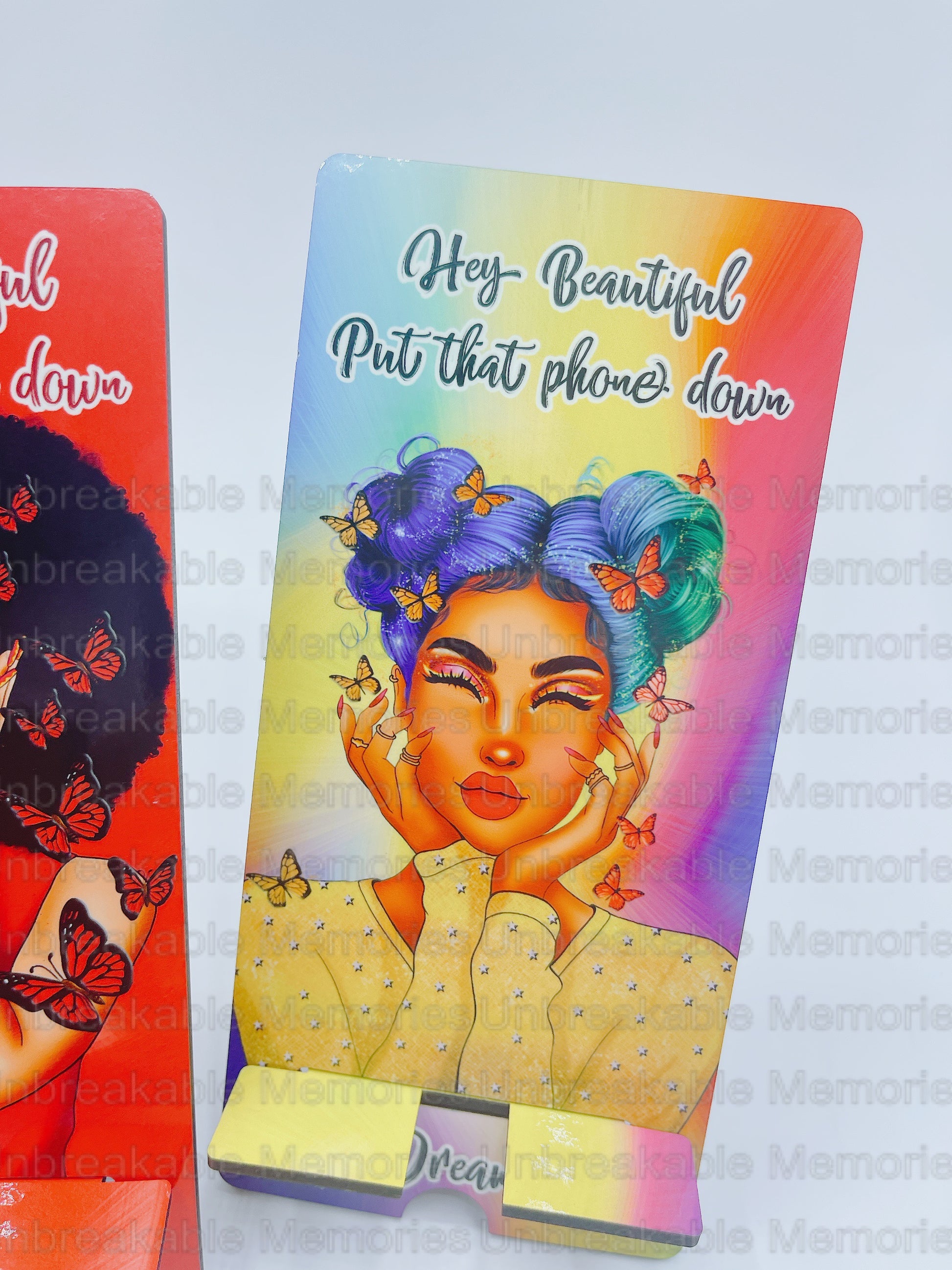 Hey Beautiful! Get rid of the distractions and create your very own place of silence with the Put the Phone Down phone holder! This phone stand will give your phone a much needed timeout, so you can focus on those big projects and bask in your own beautiful brilliance. Put the phone down and shine!