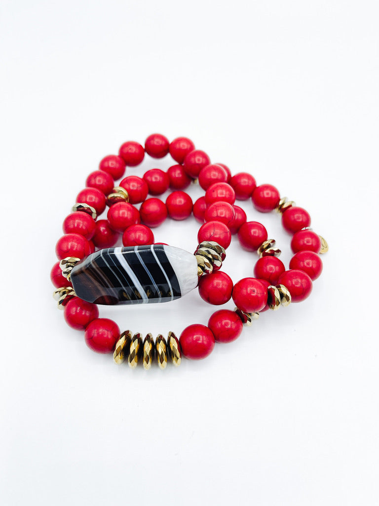 You'll be seeing red with this stunning bracelet set! Crafted with soothing howlite, it's the perfect accessory for anyone who wants to feel relaxed and enjoy a bit of calm. Wear it and experience the beauty of red!